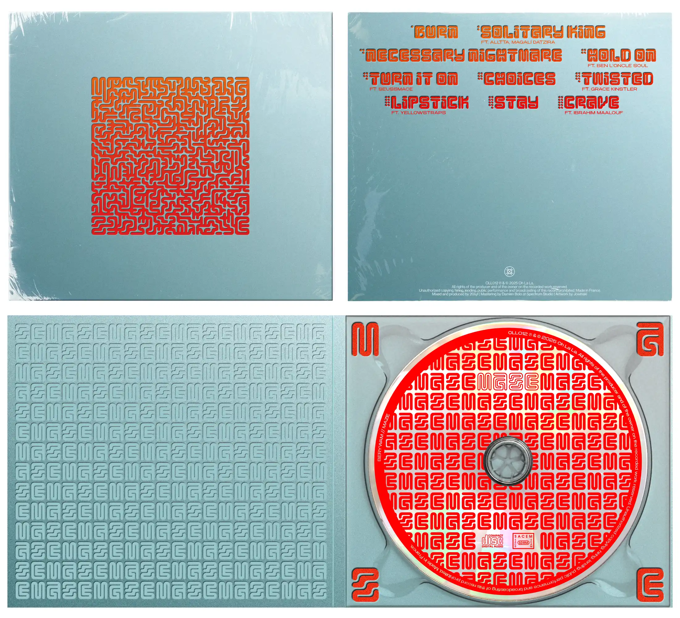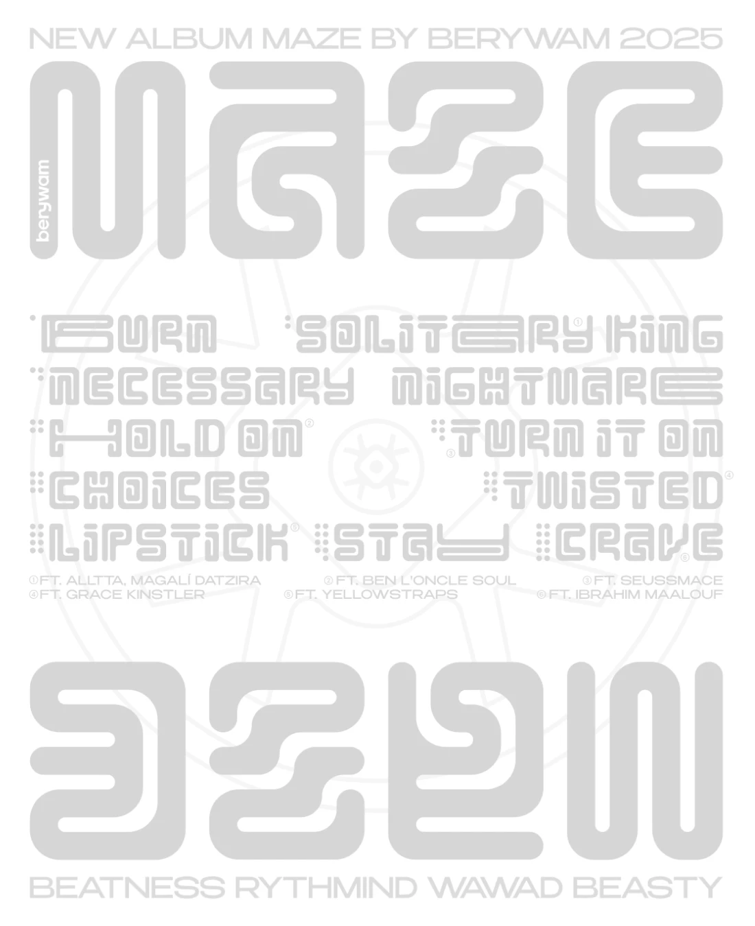 Création de l'univers graphique de l'album "Maze" de Berywam. Dans ce projet musical ambitieux où les genres se mélangent, le groupe de beatbox Berywam, internationalement reconnu, m'a demandé de concevoir l'univers visuel de leur nouvel album MAZE. J'ai donc crée leur nouveau logotype, l'artwork ainsi que le packaging CD. La typographie est conçue exclusivement pour ce projet afin de rappeler le thème du labyrinthe. Sorti le 21 novembre 2025, édition CD.