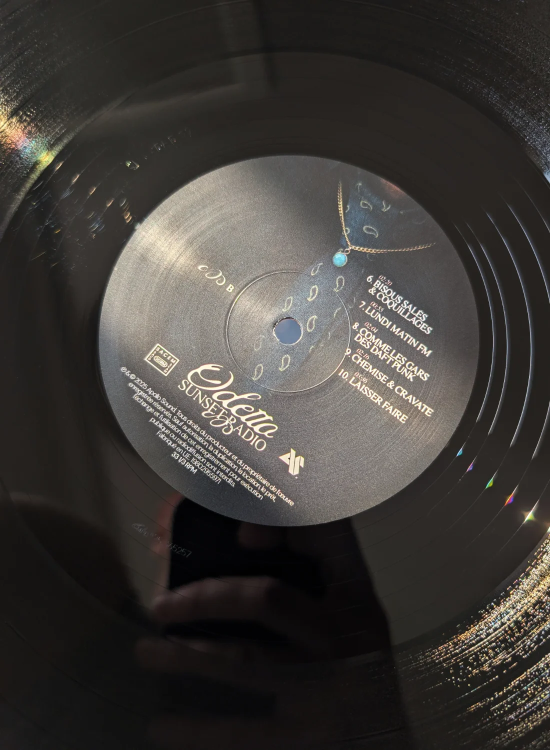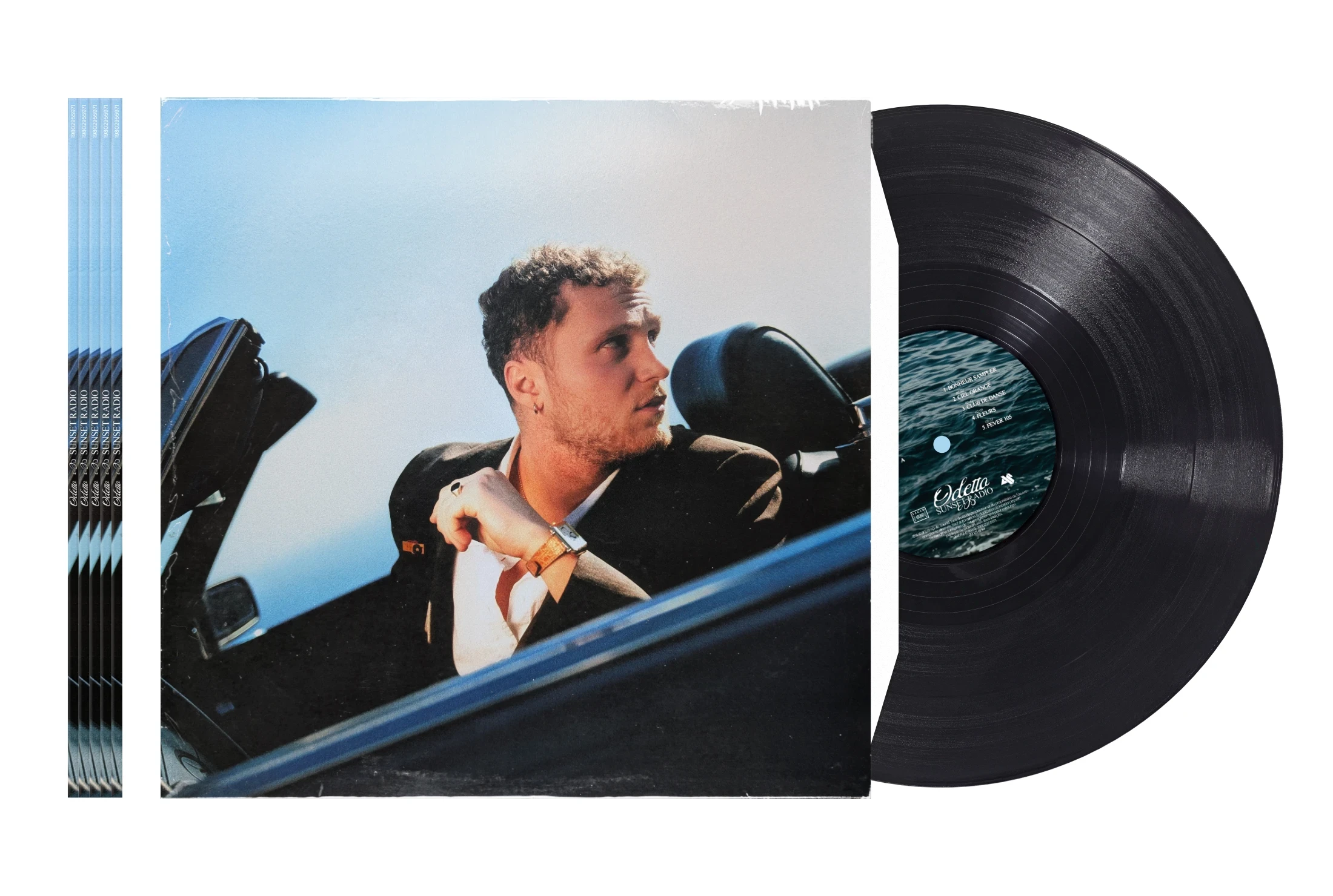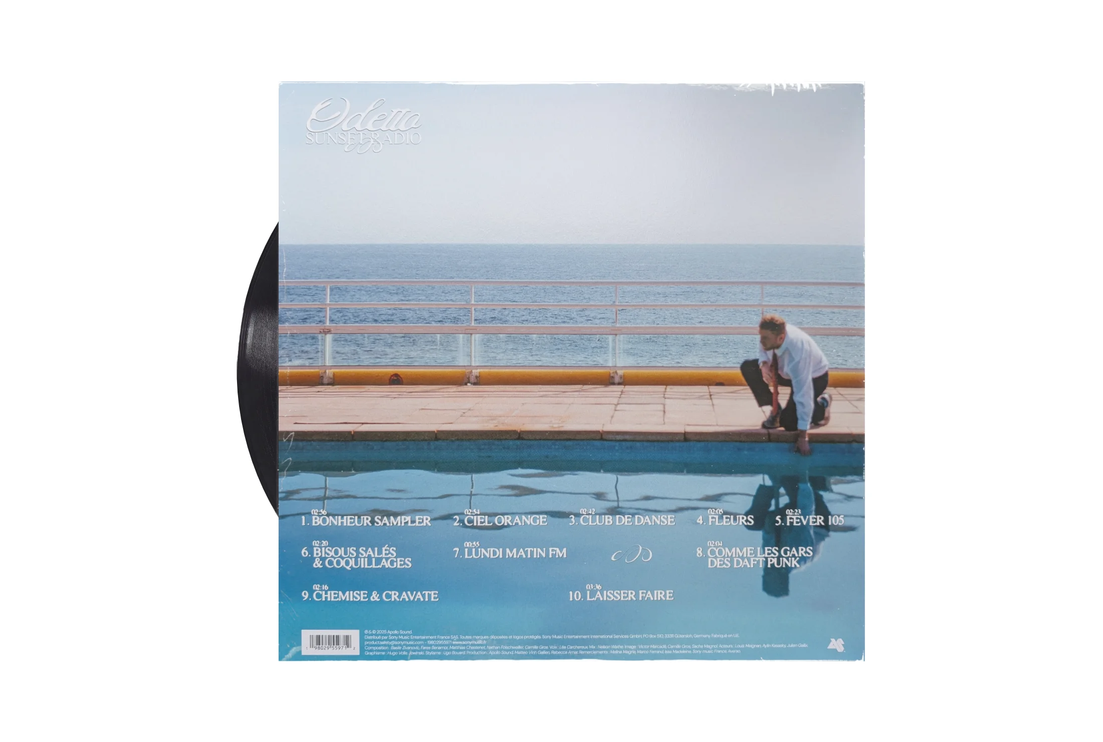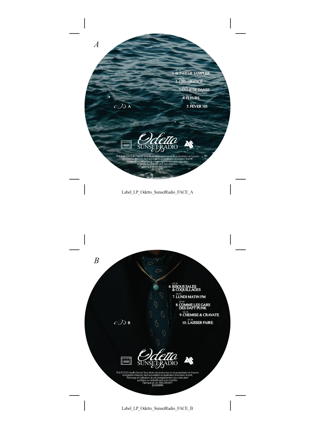 Packaging LP et création des labels papiers (face A+B) pour l'album d'Odetto "Sunset Radio". Sorti le 30 mai 2025, édition vinyle. Photographie : Victor Marcadé DG : Hugo Volle